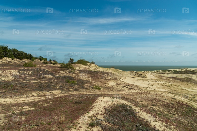 Прибрежные песчаные дюны с редкой растительностью под красивым голубым небом