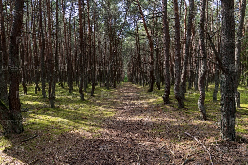 Извилистый путь через лес высоких сосновых деревьев, покрытых зеленым мхом. Танцующий лес