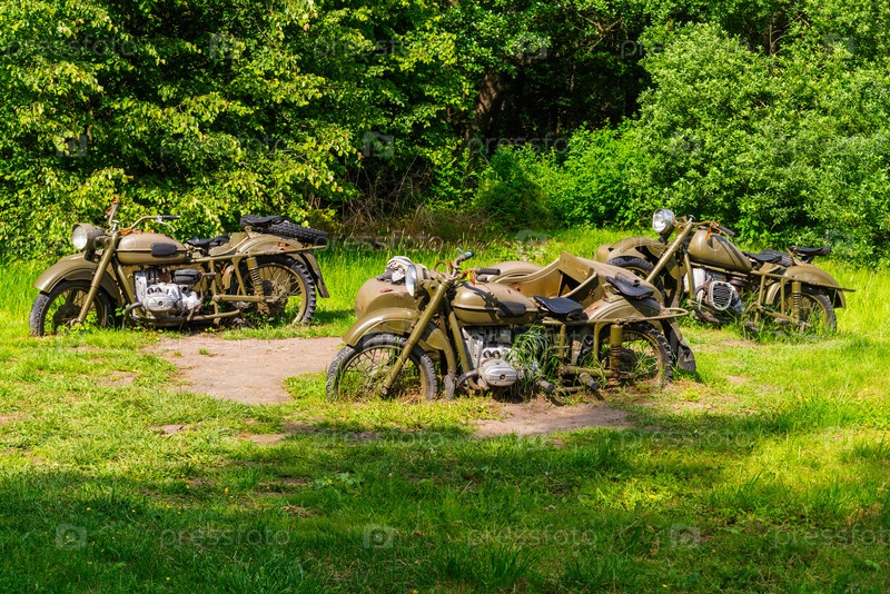 Три античных военных мотоцикла с инвалидными колясками установлены на мемориале воинам-мотоциклистам. Калининградская область