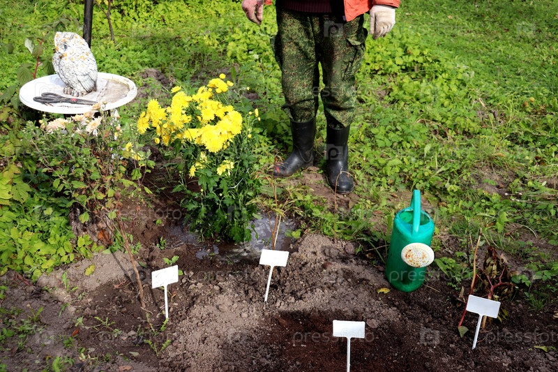 Пенсионерка стоит рядом с леукой и недавно посаженным кустом желтых хризантемов на садовом ложе в солнечный осенний день