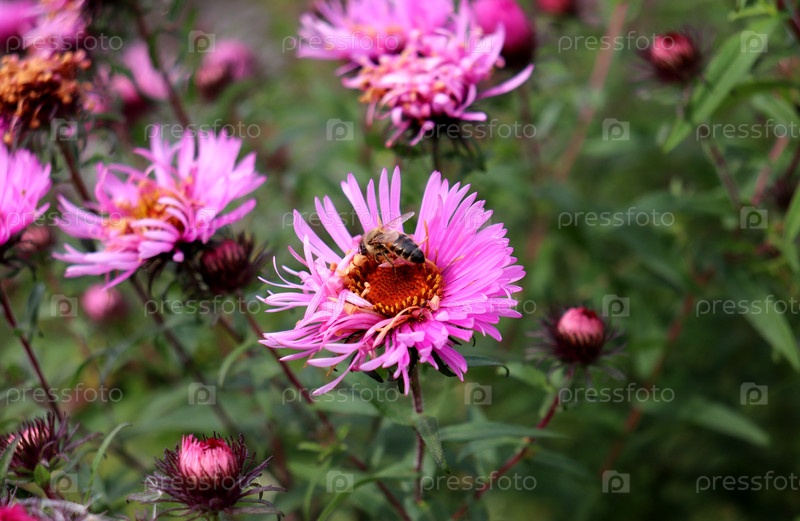 Пчела опыляет розовый астра цветок в саду на пасмурный осенний день