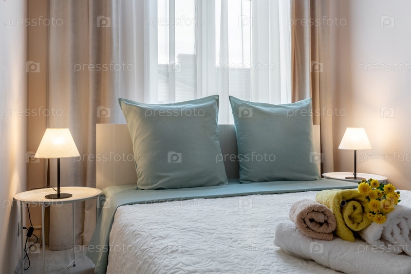 Яркая современная спальня с мягкими подушками, сотовыми лампами и аккуратно сложенными полотенцами с желтыми цветами на белом одеяле
