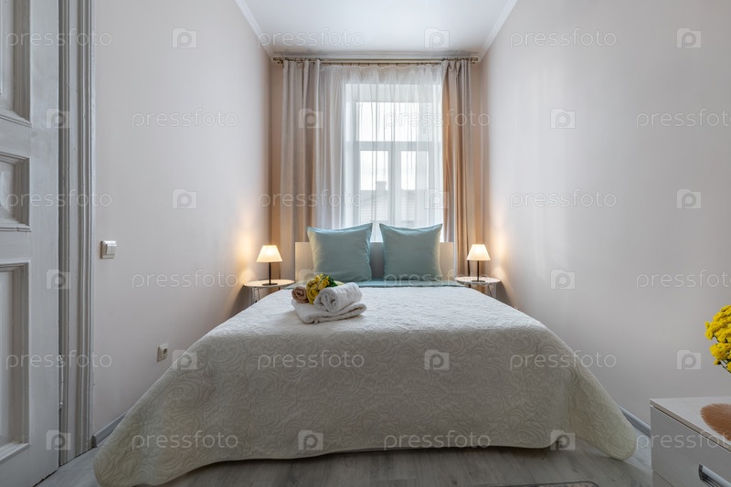 Минималистическая уютная спальня с мягким освещением, элегантным декором и аккуратно расположенными полотенцами на кровати с пастельными подушками