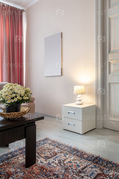 Стильный элегантный интерьер гостиной с цветочной аранжировкой, декоративной лампой и античным ковром, создавая уютную атмосферу