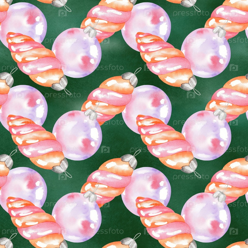 Бесшовный рисунок рождественских игрушек на зеленом фоне для ткани, обоев, упаковочной бумаги, поздравительных открыток, дизайна, декора и иллюстрации