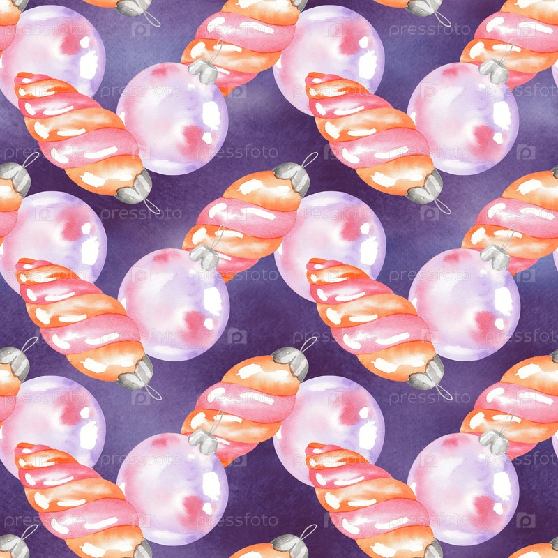 Бесшовный рисунок рождественских игрушек на фиолетовом фоне для ткани, обоев, упаковочной бумаги, поздравительных открыток, дизайна, декора и иллюстрации