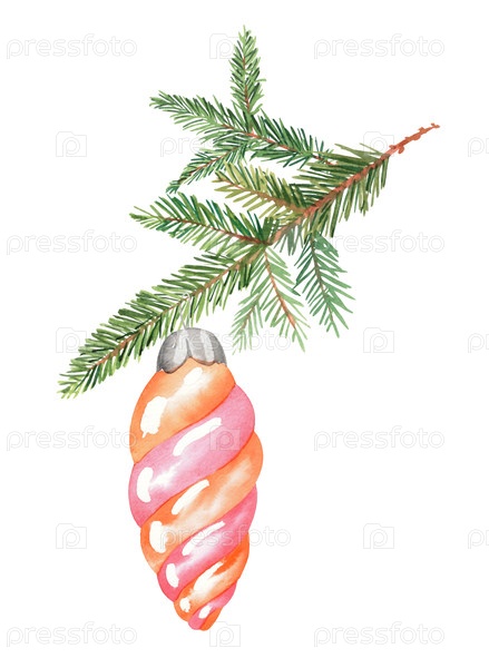 Игрушка для рождественской елки висит на ветке дерева.Для ткани, обоев, упаковочной бумаги, поздравительных открыток, дизайна, декора и иллюстрации