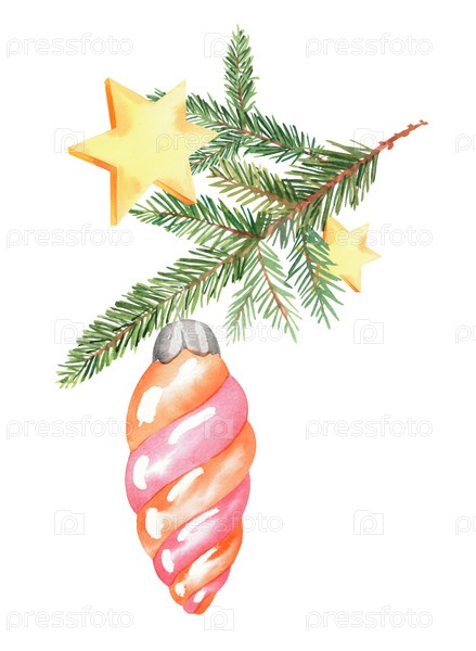 Игрушка для рождественской елки висит на ветке дерева и звезде.Для ткани, обоев, упаковочной бумаги, поздравительных открыток, дизайна, декора и иллюстрации