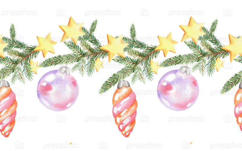 Бесшовная граница рождественских сумок, игрушек и звезд. для ткани, обоев, упаковочной бумаги, поздравительных открыток, дизайна, декорации и иллюстраций