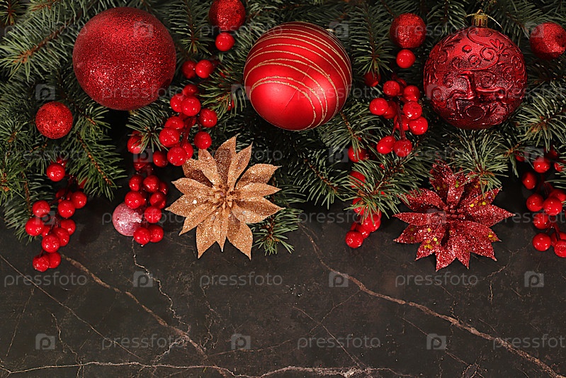 Рождество и Новый год 2026 фон с живыми ветвями сосны и праздничными украшениями на темном мраморном столе, баннер для праздничного дисплея, шаблон дизайна