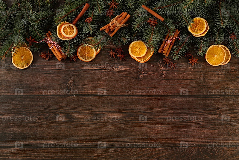 Свежие ветви пихты с сушеными апельсинами, звездным анисом, корицей и сосновыми шишками на деревянном столе. рождественская композиция и концепция Нового года 2026, новогодняя модель для дизайна продукта и демонстрации