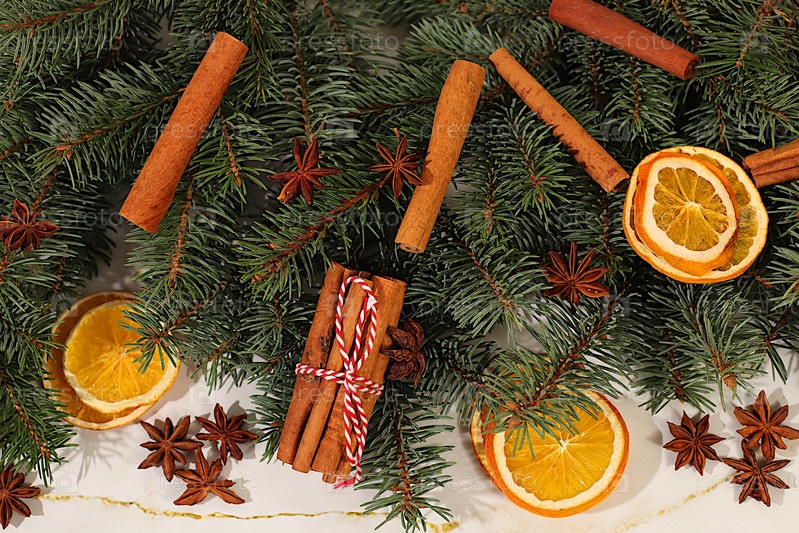 Рождественская композиция и концепция Нового года 2026, живые ветви пихты с сушеными апельсинами, звездным анисом, корицей и сосновыми шишками на деревянном столе, новогодняя модель для дизайна и демонстрации продукции, баннер