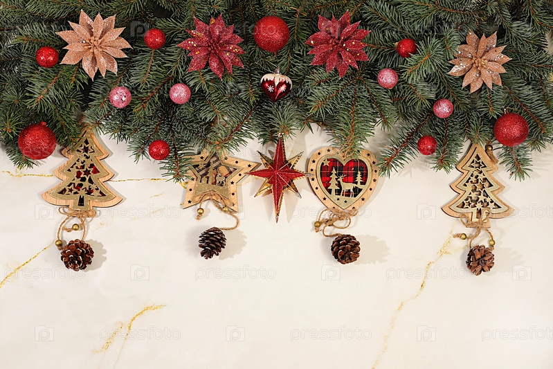 Рождество и Новый год 2026 фон с живыми ветвями пихты и праздничными украшениями на мраморном столе, праздничный баннер, шаблон дизайна, концепция канун Рождества, рождественская открытка