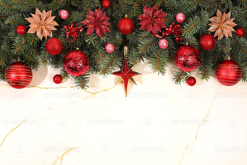 Рождество и Новый год 2026 фон с живыми ветвями пихты и праздничными украшениями на мраморном столе, праздничный баннер, шаблон дизайна, концепция канун Рождества, рождественская открытка