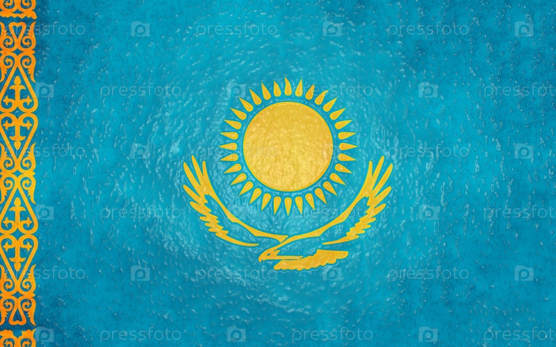 Текстурированный фон, представляющий национальный флаг Казахстана с золотым солнцем, степным орлом и традиционными орнаментами