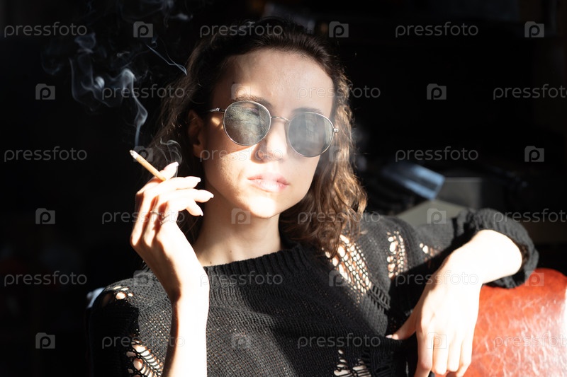 Портрет молодой красивой женщины в темных очках с сигаретой, сидящей возле окна в черном свитере