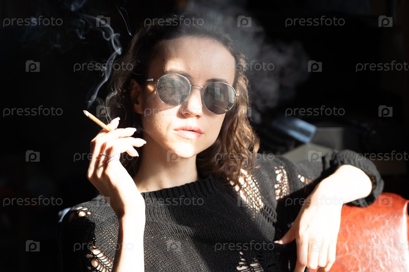 Портрет молодой красивой женщины в темных очках с сигаретой, сидящей возле окна в черном свитере