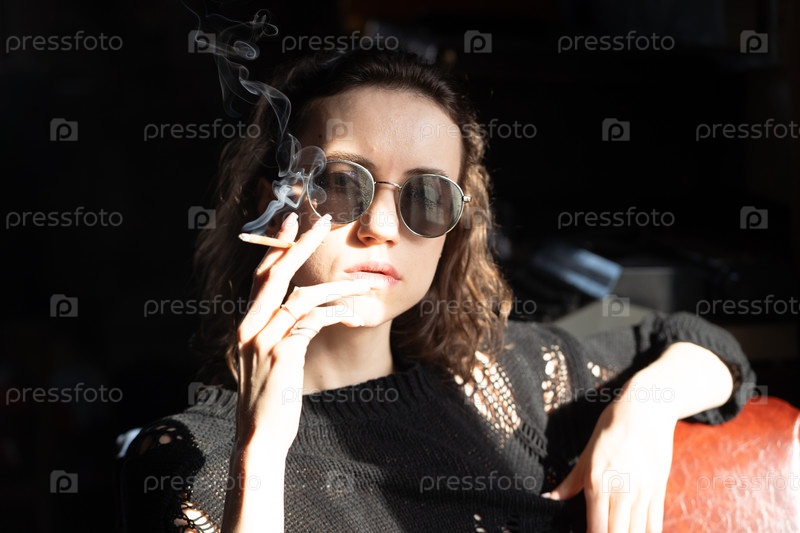 Портрет молодой красивой женщины в темных очках с сигаретой, сидящей возле окна в черном свитере