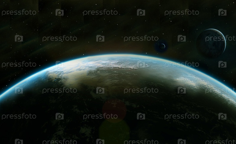 Земля и две другие планеты показаны из космоса с темным звездным фоном