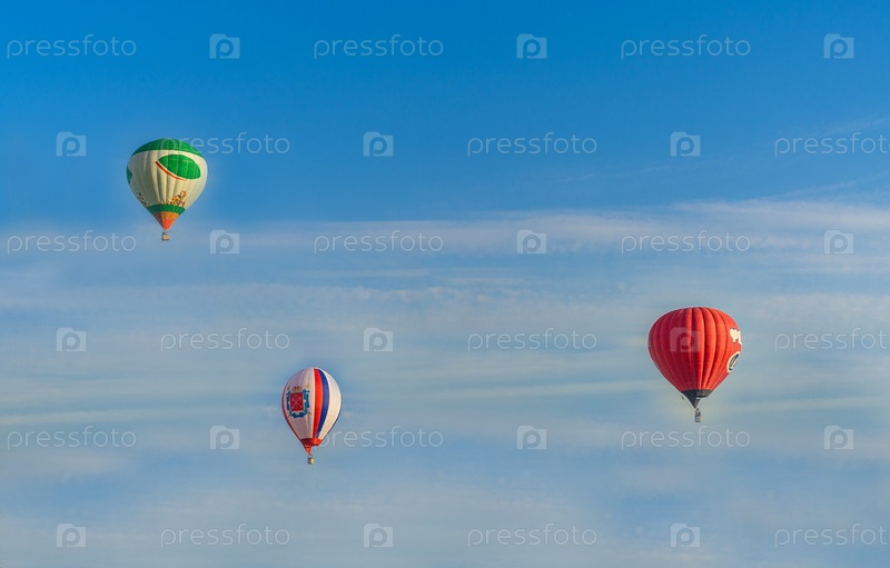 Балоны разных цветов взлетают в летний день по голубому небу с легкими облаками, Беларусь, Минск