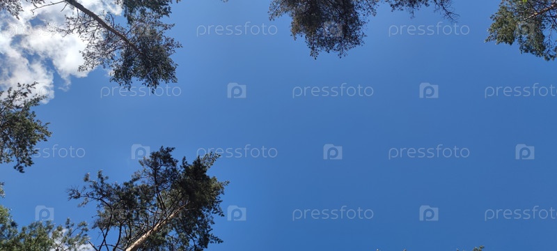 Голубое небо над вершинами деревьев. Сосновый лес, длинные коричневые стволы сосен поднимаются высоко. Сверху можно увидеть ветви с зелеными иглами и синее небо без облаков