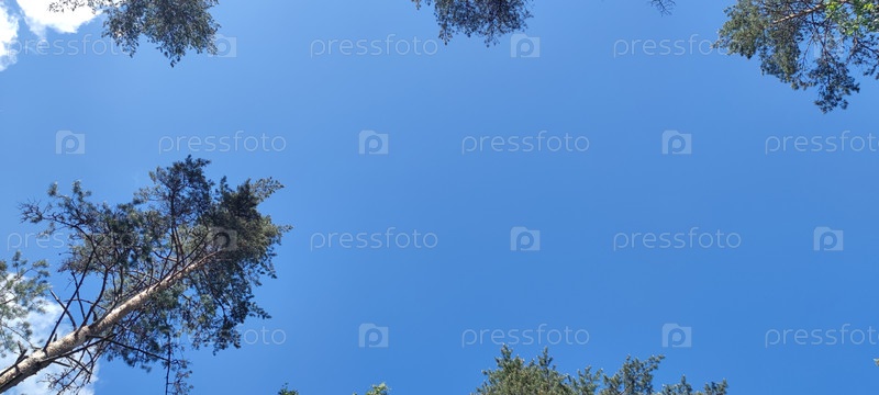 Голубое небо над вершинами деревьев. Сосновый лес, длинные коричневые стволы сосен поднимаются высоко. Сверху можно увидеть ветви с зелеными иглами и синее небо без облаков