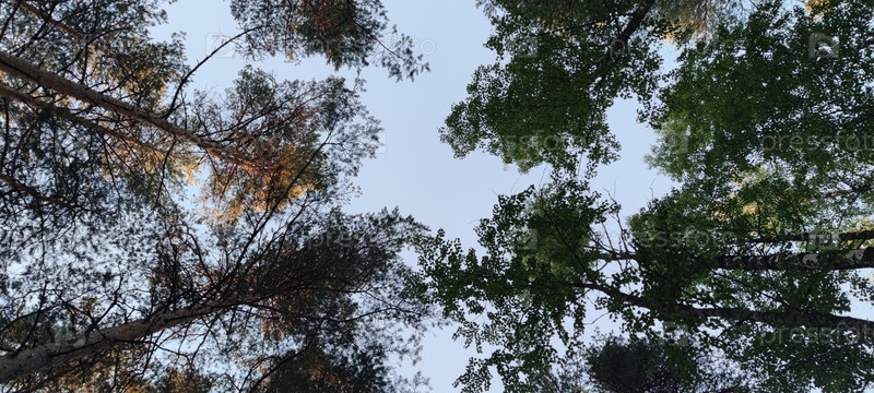 Голубое небо над вершинами деревьев. Сосновый лес, длинные коричневые стволы сосен поднимаются высоко. Сверху можно увидеть ветви с зелеными иглами и синее небо без облаков