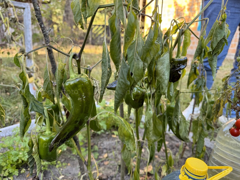 Зеленый сладкий перец на кусте в садовом клумбе.Листья перца засохли от первого мороза