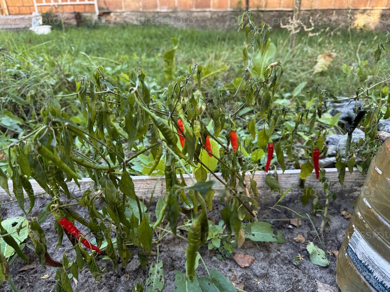 Горячий красно-зеленый перец на кусте в садовом клумбе