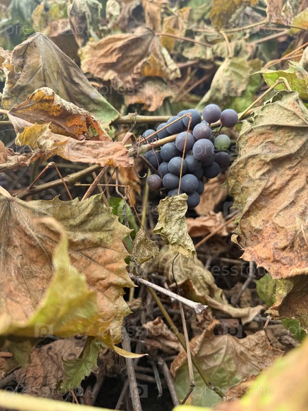 Виноградная лоза, поврежденная первым морозом. Живые и мертвые листья винограда. Среди листьев видны зрелые кластеры