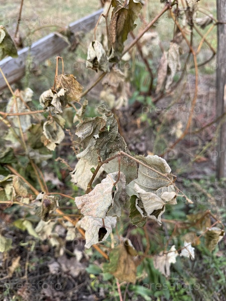Виноградная лоза повреждена первым морозом. мертвые листья винограда