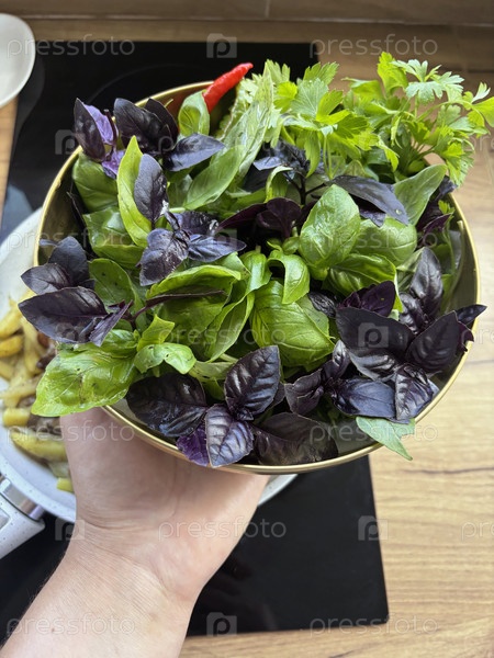Чаша с базиликом в руках женщины. против индукционной колбы. вид сверху