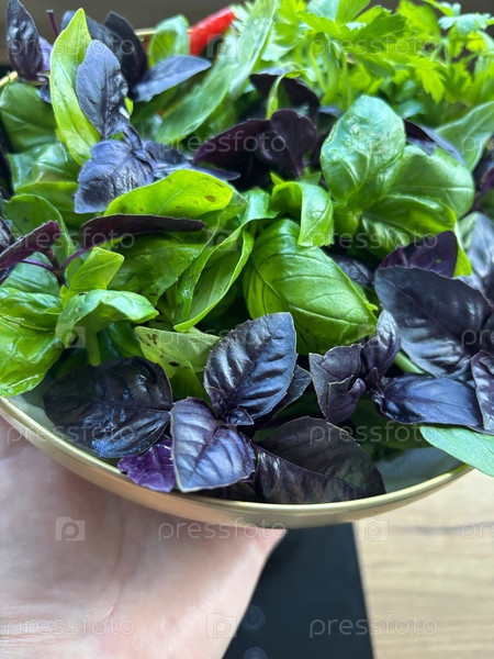Чаша с базиликом в руках женщины против индукционной колбы вид сверху закрыть