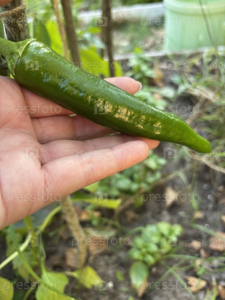 Женщина держит в руке сладкий зеленый перец. на фоне садовой кровати