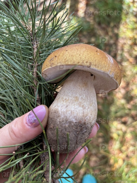 Самка-охотница за грибами держит в руках гриб порчини и сосновую ветвь на фоне осеннего лесного пола