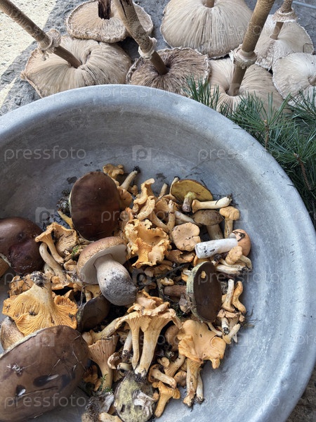 бассейн с съедобными грибами. вблизи есть паразольные грибы. близко. снимок сверху