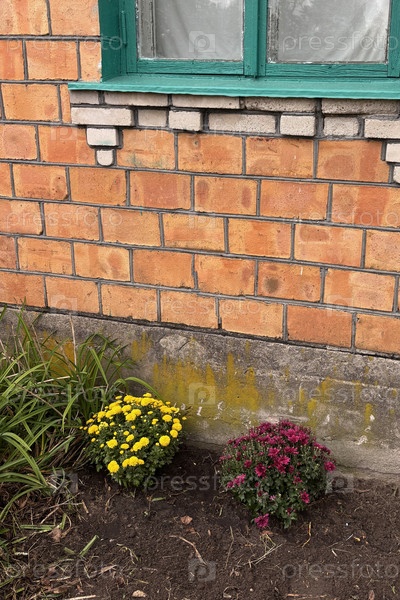 Желтые и коричневые хризантемы посажены рядом со стеной дома