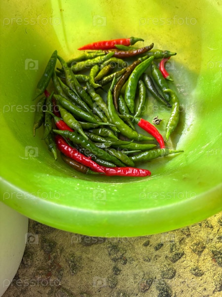 Горячий перец. красно-зеленый. в пластиковом контейнере. снимок сверху