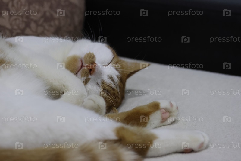 Имбирный кот с белыми пятнами спит на боку, свернувшись в шар