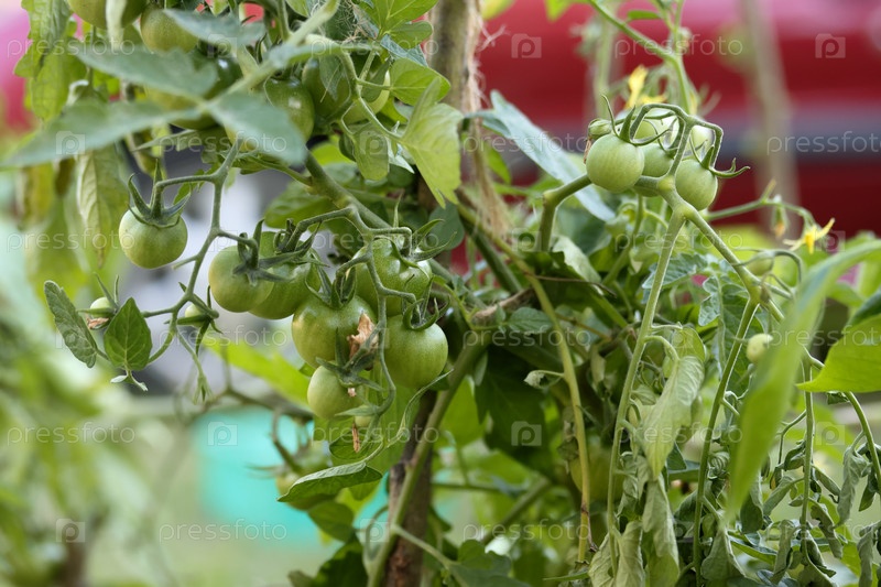 Зеленые помидоры созревают в садовой кровать