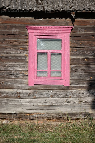 Винтажная деревянная оконная рама в старой бревенчатой стене