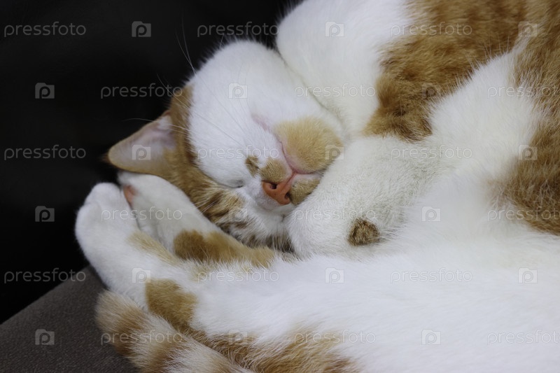 Имбирный кот с белыми пятнами спит на боку, свернувшись в шар