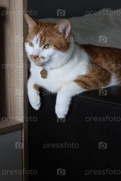 на османе сидит имбирный кот с белыми пятнами, передними лапами. вокруг его шеи висит кошачий подвесок в форме лапы