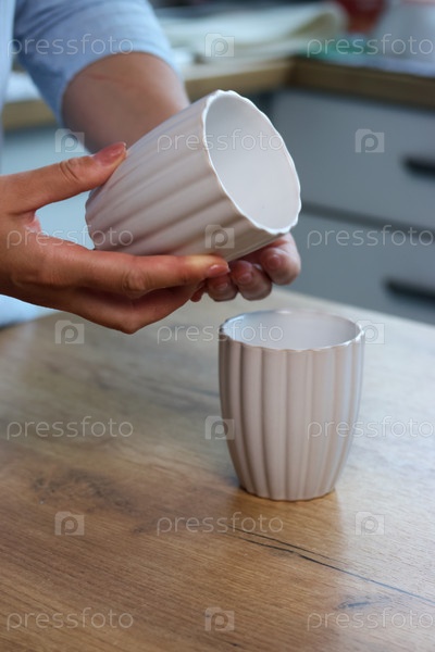 Женщина смотрит на кружки с фарфоровым чаем. Набор чайных стаканов. Вертикальный снимок