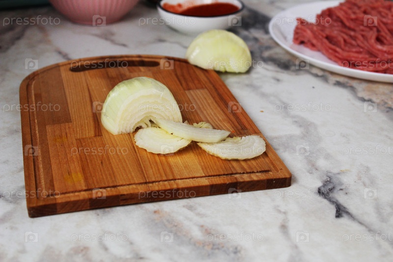 Срезки измельченного лука лежат на деревянной доске Посмотреть со стороны