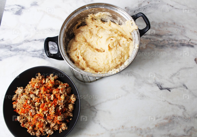Картофельное пюре и фаршированное мясо в тарелке, приготовление пастушеского картофельного торта. вид сверху