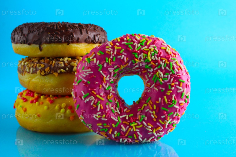 Натюрм, сладкие пончики в розовой глазуре с цветным распылителем, стоит рядом со стопкой пончиков на ярко-синем фоне