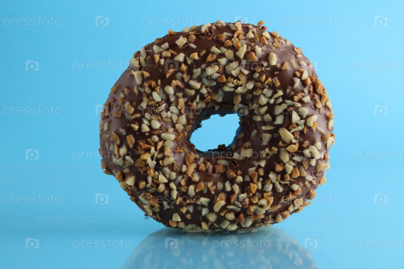 Берлинский пончик с шоколадом и орехами лежит на ярко-синем фоне