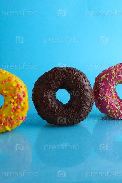 Берлинские пончики в желтой и розовой шоколадных глазурах на черно-синем фоне
