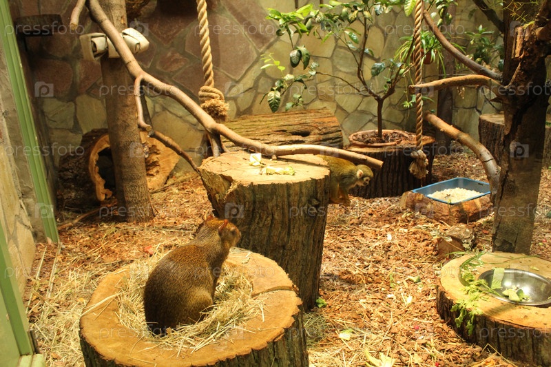 Маленькая обезьянка и агути сидят на деревянной рамке из конопли